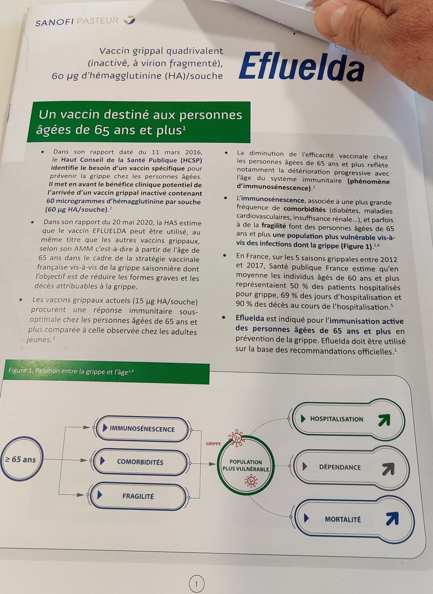 Le vaccin EFLUELDA nest pas soumis à prescription médicale obligatoire. Indiqué pour limmunisation active des personnes âgées de plus de 60 ans il. La SFGG recommande vivement lutilisation du vaccin grippal quadrivalent haute dose Efluelda pour les personnes âgées à partir de 65 ans étant donné lefficacité clinique supérieure dont il a fait la preuve dans cette population par rapport aux vaccins à dose standard.