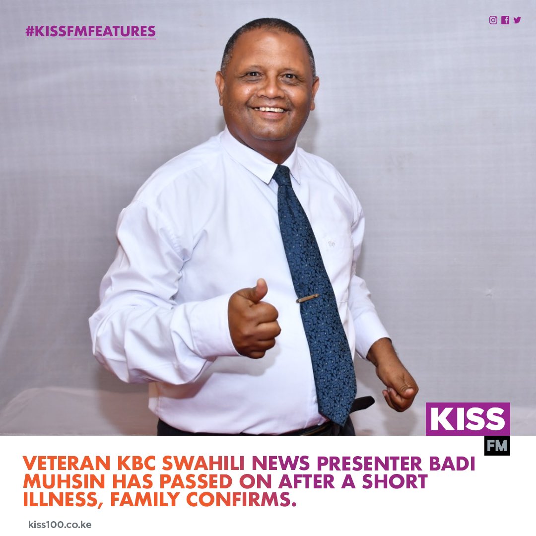 Veteran Kenya Broadcasting Corporation KBC journalist Badi Muhsin is deadThe Swahili maestro passed away on Friday October 8 2021. NAIROBI Kenya Oct 8 Veteran broadcaster Badi Muhsin who recently made a comeback on State television KBC anchoring Kiswahili news has died aged 67. In 2020 the veteran TV anchor underwent surgery to remove stones in his kidney.