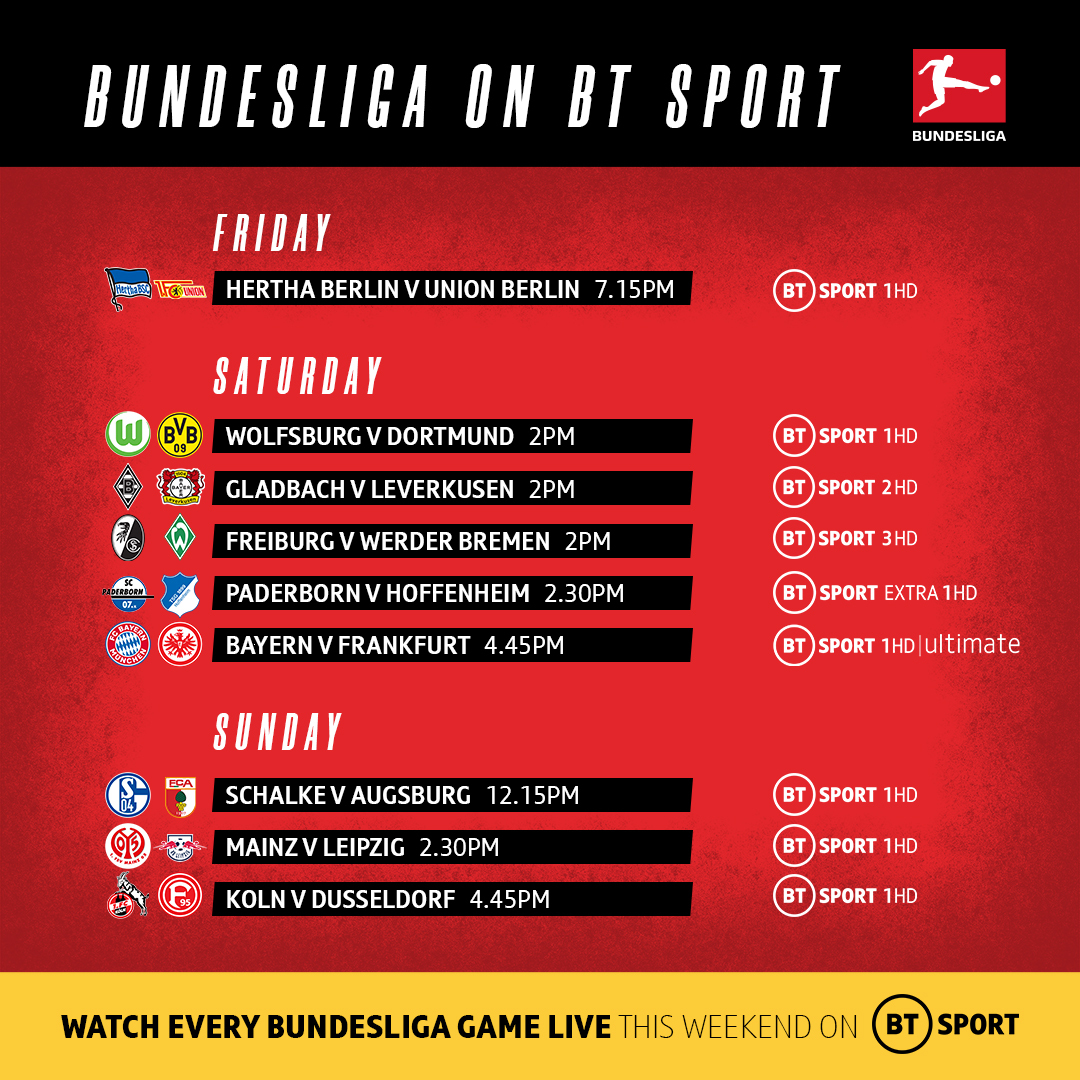 Football On Bt Sport On Twitter Another Stacked Weekend Of Bundesliga Hertha V Union Wolfsburg V Dortmund Gladbach V Leverkusen Freiburg V Bremen Paderborn V Hoffenheim Bayern V Frankfurt Schalke V
