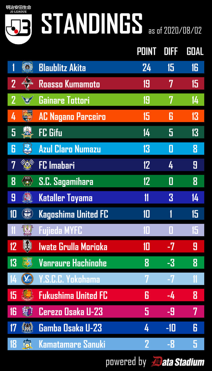 Football Lab Ar Twitter 明治安田生命j3リーグ 順位表 2020 08 02 J3第8節終了時点の順位表です 首位の ブラウブリッツ秋田 が8連勝 いわてグルージャ盛岡 は3連勝で12位に浮上 Jリーグ Jleague Footballlab Https T Co Ioaqyynjew